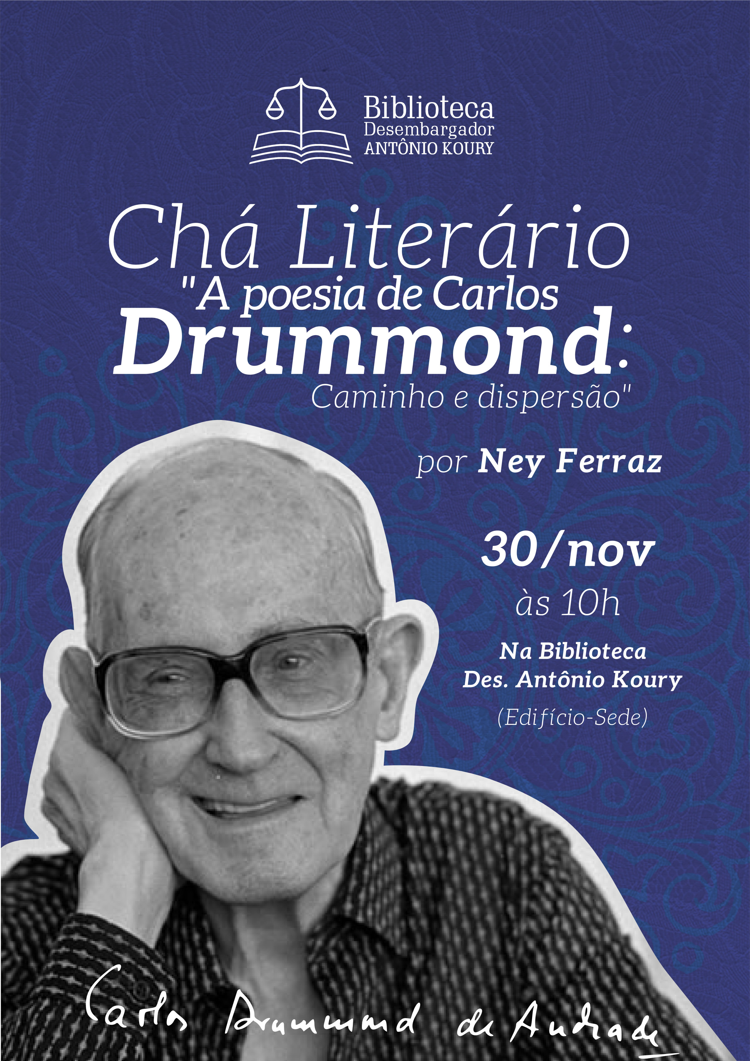Cartaz referente ao Chá literário com o tema: "A poesia de Carlos Drummond: caminho e dispersão", realizado em 30/11/2018, palestrante: Ney Ferraz. O Chá Literário, é um projeto desenvolvido pela Biblioteca "Desembargador Antônio Koury" com o propósito de apresentar escritores brasileiros ao público de forma dinâmica e descontraída.